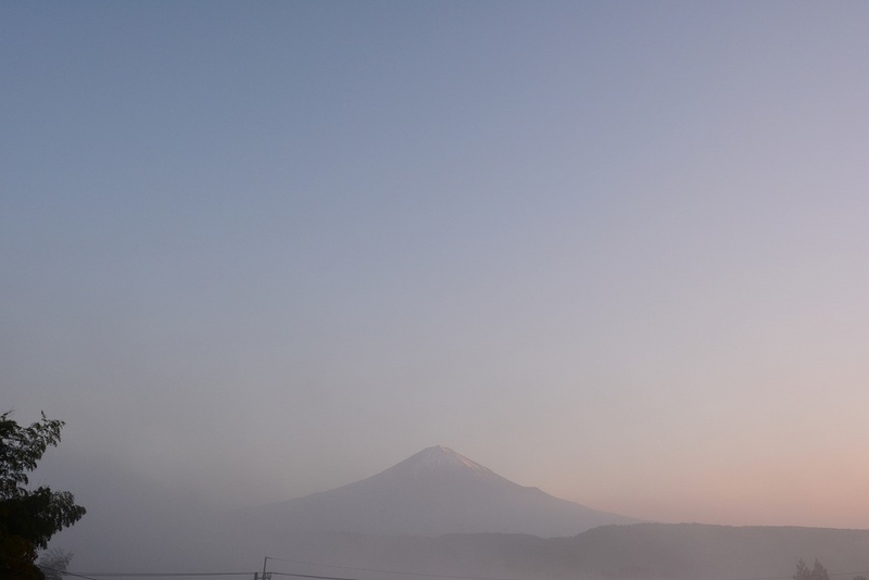 川靄の向こうに朝日に映える富士山がいる。